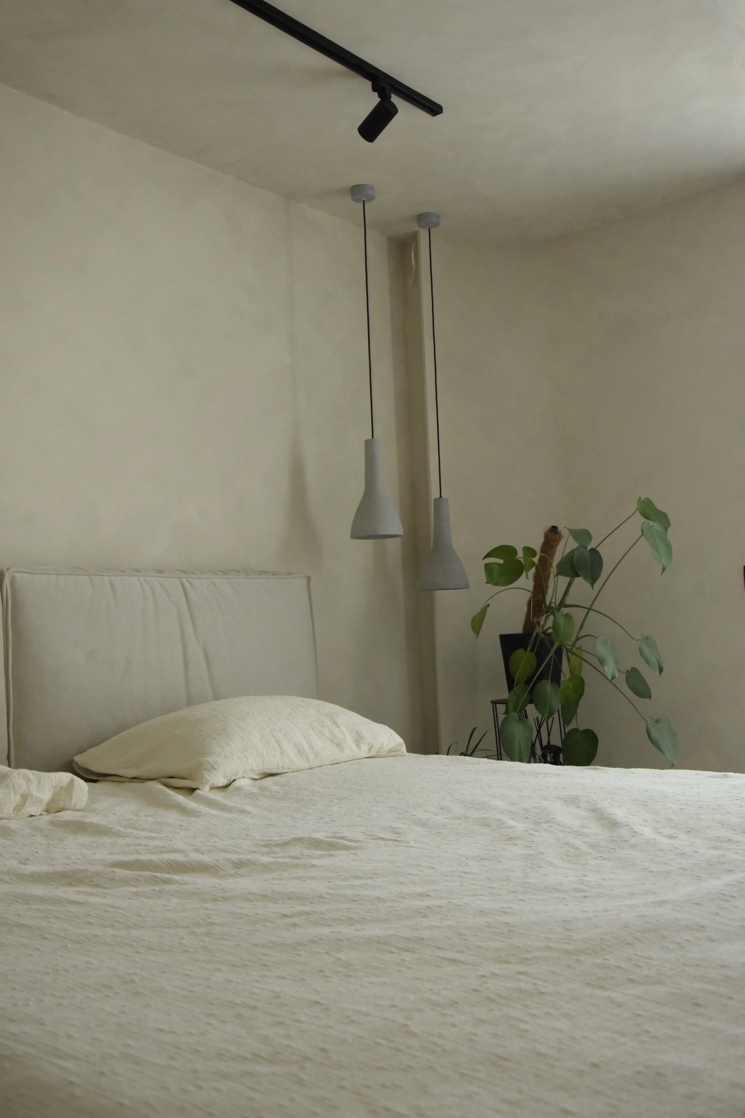 This apartment combines natural textures, muted colors, and sculptural lights in a play of contrasts between clean geometry and organic softness. The couple’s personal imprint — especially in the handmade plaster finish of the bedroom — makes the space not only aesthetically refined, but deeply personal.